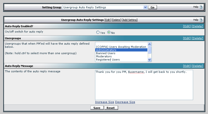 - AdminCP -> vBulletin Options -> Usergroup Auto Reply Settings
