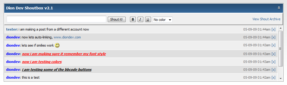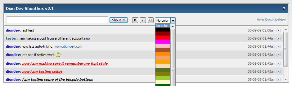 - B, I, U, and color buttons for shouts that are remembered for each shout until the member navigates away from the page