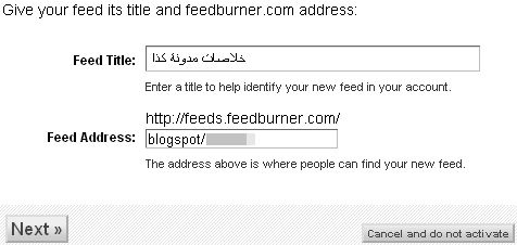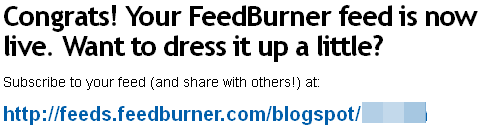5 تهانينا , تم انشاء عنوان للخلاصات الخاصة بمدونتك و تكون على الصيغة التالية مثلاً ( http://feeds.feedburner.com/blogspot/YywT ) كما هو موضح بالصورة أدناه.
