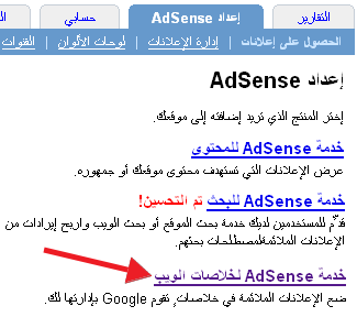 6 توجه الآن للوحة تحكم أدسنس الرئيسية , و منها قم بالدخول على التبويب ( اعداد Adsense ) , ثم اختر ( خدمة أدسنس لخلاصات الويب ).