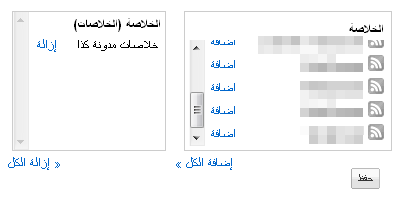 ستجد فى نهاية الصفحة التى ما زلنا فيها جدولاً به أسماء كافة الخلاصات التى قد أنشأتها سابقاً , و من ضمنها تلك التى أنشأناها مؤخراً عن طريق خدمة Feed Burner و التى أسميناها " خلاصات مدونة كذا " كما هو موضح فى الخطوة 4 . قم بالضغط على " اضافة " الموجودة أمامها لتنتقل للجدول الموجود على اليسار و أخيراً اضغط " حفظ " لحفظ كافة التغييرات التى أحدثناها.