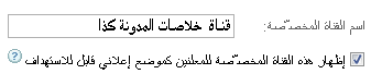 - قم التأشير أمام جملة "إظهار هذه القناة المخصصة للمعلنين كموضع اعلانى قابل للاستهداف " , و سيظهر لك بعدها ما يسمى بـ " الاسم الخارجى " و هو الاسم الذى يظهر للمعلن الذى يريد استهداف ظهور اعلاناته فى خلاصات مدونتك , و كذلك يمكنك توصيف اهتمامات مدونتك و نوعية الزوار المترددين عليها و كذلك موضع تلك الوحدة الاعلانية ؛ لتسهل على المعلن معرفة طبيعة مدونتك التى قد يرغب فى استهداف وضع اعلاناته فى خلاصاتها و ذلك أمام البند " الوصف" كما هو موضح فى الصورة أدناه , ثم اضغط " اضافة " ليتم حفظ التغييرات :
