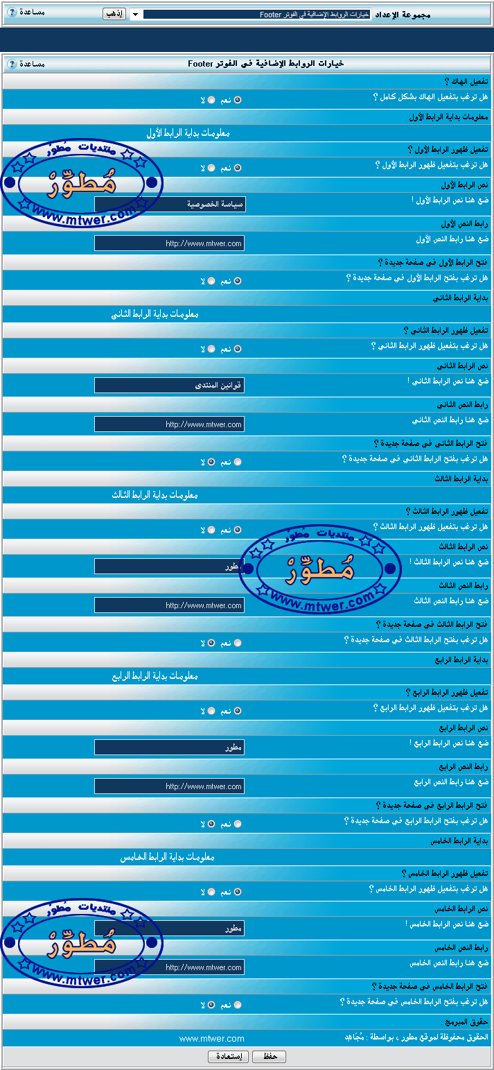 صورة للخيارات الخاصة بهاك الروابط الإضافية في الفوتر Footer .!
