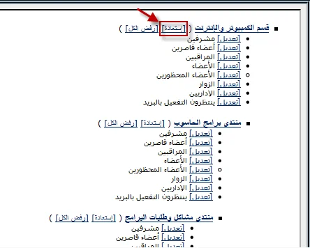 ملاحظة: عند عمل إستعادة صلاحيات القسم الرئيسي سوف يتم إستعادة صلاحيات المجموعات للمنتديات التي توجد في القسم الرئيسي