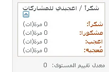 السلام عليكم ، المشكلة هي عدم ظهور عدد مرات الشكر والأعجاب و... في احصائيات الشكر تحت بيانات العضو مع العلم انها تظهر في ملف العضو ..