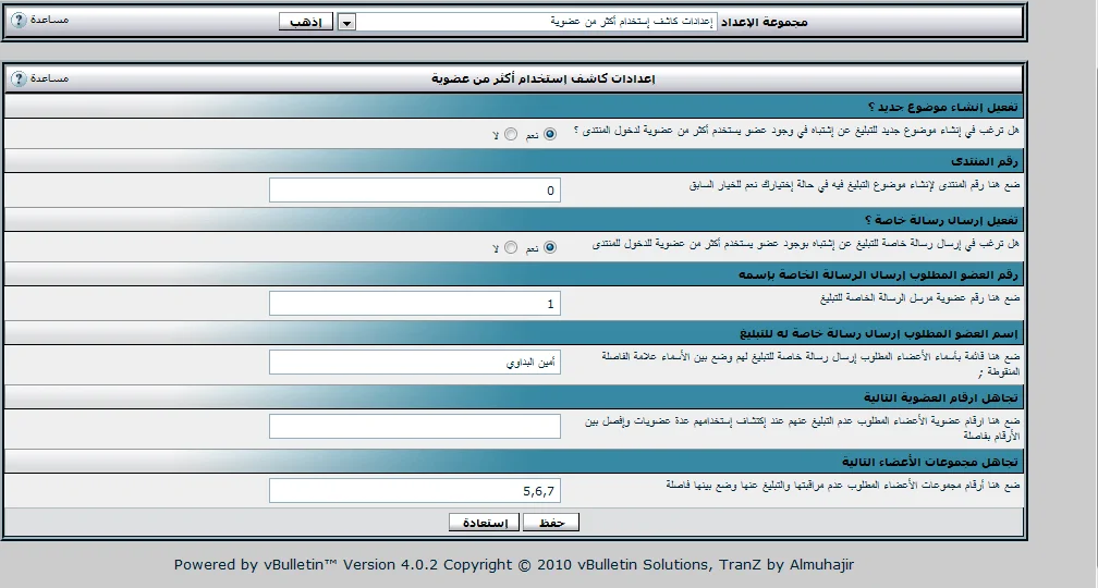بعد تركيب المنتج يتوجب عليك مراجعة الإعدادات الخاصة به من خلال لوحة تحكم المنتدى ثم خيارات المنتدى ثم خيارات المنتدى ثم إعدادات كاشف إستخدام أكثر من عضوية وهناك تستطيع تحديد ما يلي :