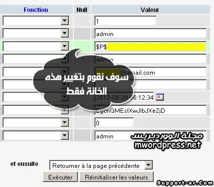 UPDATE `wp_users` SET `user_pass` = MD5( ‘الرقم السري الجديد’ ) WHERE `wp_users`.`user_login` = “اسم المستخدم”;