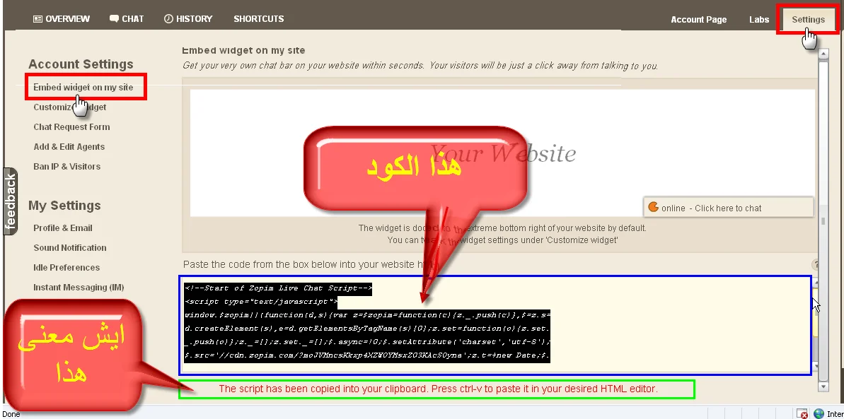 للدخول الى لوحه التحكم من هنا dashboard.zopim.com