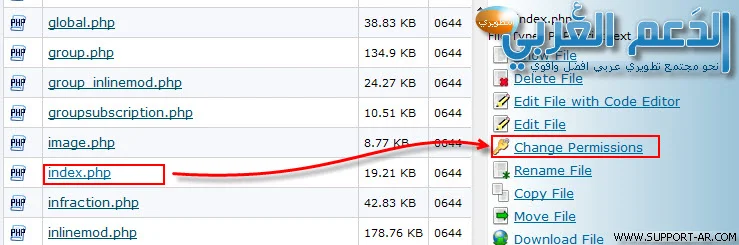 رد: تغيير تصاريح الملفات تروح للسى بانل حق موقعك ثم إلى مدير الملفات اللى هوا File Manager او Legacy File Manager ثم تضغط على الملف او المجلد تغيير تصريحة (ملاحظة يتم الضغط على اسم الملف او المجلد وليس الايقونة المجاورة له) كما بالصورة ثم تغير التصاريح كما تحب وتضغط حفظ بالتوفيق