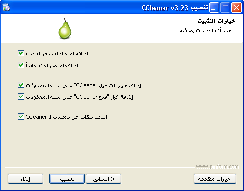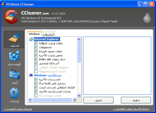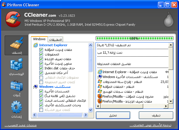 برنامج CCleaner يقوم البرنامج بتنظيف وحدة التخزين الرئيسية للتخلص من جميع الملفات المؤقتة Temporary Files والملفات الغير ضرورية التي تخزن علي الحاسب أثناء تعامل المستخدم مع مواقع الإنترنت . وبرنامج CCleaner يقوم بإلغاء هذه الملفات أوتوماتيكيا أياً كان برنامج تصفح الإنترنت الذي تتعامل معه. فالبرنامج يستطيع إلغاء الملفات المؤقتة التي تخزن علي الحاسب من خلال برنامج Internet Explorer أو برنامج Firefox كما يستطيع أيضا التخلص من قائمة المواقع التي قام المستخدم بزيارتها من قبل History وملفات الكوكز وبجانب هذه الوظائف فإن البرنامج يقوم أيضا بالتخلص من بقايا الملفات المؤقتة التي يقوم نظام التشغيل بإنشائها أثناء تأدية بعض الوظائف . ومنها علي سبيل المثال مجلد Temporary Files ومجلد الملفات الملغاة Recycle Bin وأيضا إلغاء قائمة الملفات التي قام المستخدم بفتحها Recents وذلك لضمان سرية بيانات المستخدم فلا يستطيع أي شخص التعرف علي الملفات التي قمت بتشغليها وخاصة إذا كان أكثر من شخص يستخدم الحاسب الشخصي . ويمكن من خلال البرنامج أيضا فحص ملف النظام Registry file والتأكد من سلامة البيانات الموجودة داخله وتعديلها عند الحاجة كما يمكن عرض واجهة البرنامج بعدة لغات ومنها اللغه العربية.