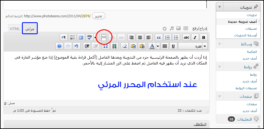 ضع مؤشر الماوس في المكان الذي تريد أن تظهر به كلمة (اقرأ تكملة الموضوع) ثم اضغط على الزر كما هو موضح بالصور: