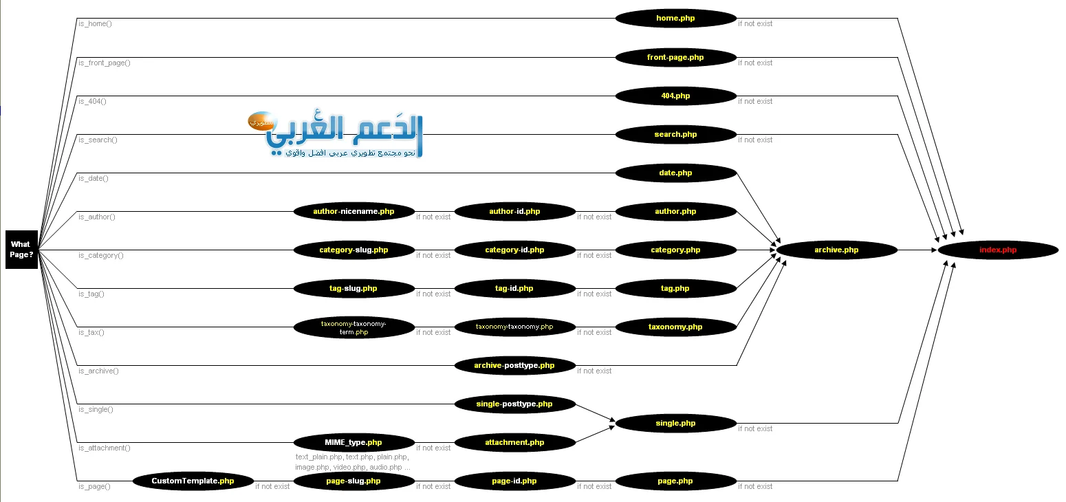 الآن لن ندخل في كل هذه التفاصيل لكن ذكرتها لكي نعلم نوع الملفات التي يمكن أن نواجهها أثناء العمل مع أي قالب عامة سواء موسع أو افتراضي أو مخصص. لكن للتنويه يمكن إدراج أيضا ملفات أضافية حسب خصوصية البرمجة لمبرمج القالب. لكن مع كل ذلك شاهدوا الصورتين التاليتين لمزيد من التفاصيل عن طريقة عمل هذه الملفات حسب أرشيف موقع مطوروا wordpress الرئيسي: