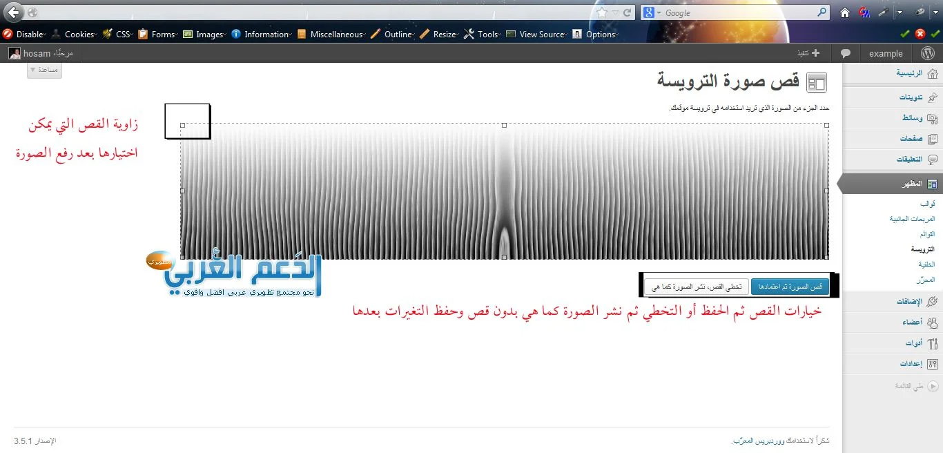 بعد اختيار الملف المراد رفعه نضغط على زر رفع ونلاحظ ظهور الصورة نقوم بحفظ التغيرات دون قص حيث أننا نعتمد نفس الأبعاد المحددة لكن يمكن استخدام ميزة القص بواسطة تحديد المربع المراد قصه من الصورة في حال كانت أكبر من الحجم المطلوب وتطبيق القص على الجزء المطلوب بكلا الحالتين يمكن حفظ التعديلات ونشاهد بعدها ظهور الرسالة: