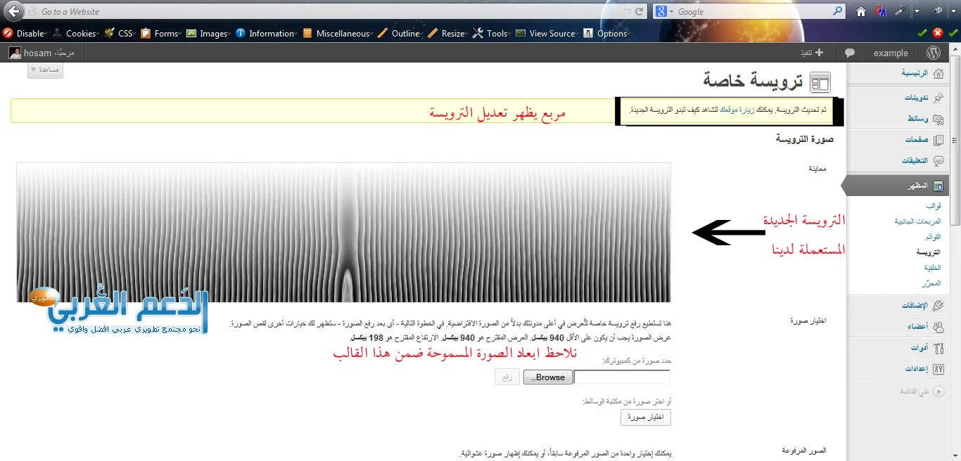 - صورة الترويسة: هي الصورة التي تستعمل تحت الوصف واسم الموقع في العنوان العلوي للصفحة يمكننا من هنا تغيير هذه الصورة لكن ينصح باستخدام صورة تحمل نفس ابعاد الصورة السابقة لكن المحتوى لنا حرية اختياره, على العموم مفيد للتغير السريع فقط التعديل الكامل يحتاج للعمل مع الملف header.php