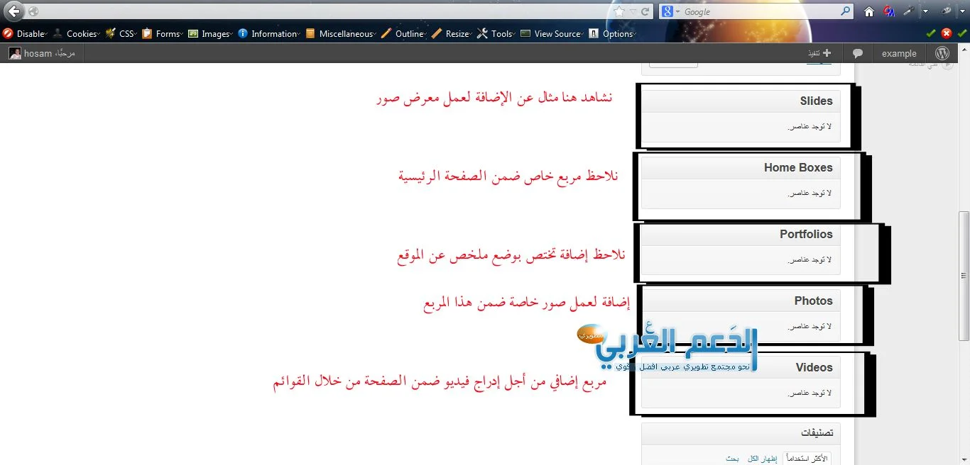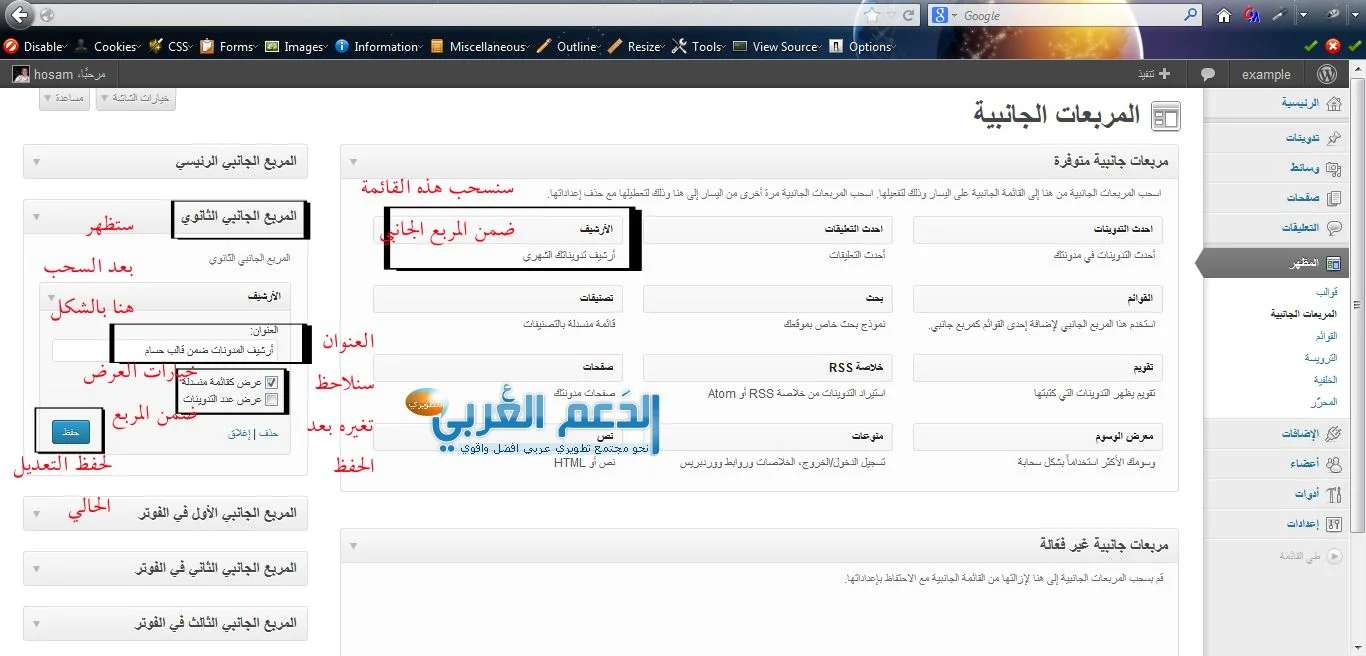 الجواب بسيط اقرأ مكان كل مربع من خلال عنوانه مثال (المربع الجانبي في الفوتر) لكن يقول البعض بعضها غير واضح مثال (المربع الجانبي الثانوي) أقول الموضوع بسيط جداً اختر أي من المربعات الجانبية المتوفرة واسحبه لهذا المربع ثم أحفظ التغيرات ستلاحظ مكان المربع الجانبي الثانوي وأيضاً ضمن أي مربع تختارونه لمزيد من التجارب على العموم سأعطي مثال في الصورة ونشرح ماذا فعلنا بالضبط ضمن هذه الخطوات: