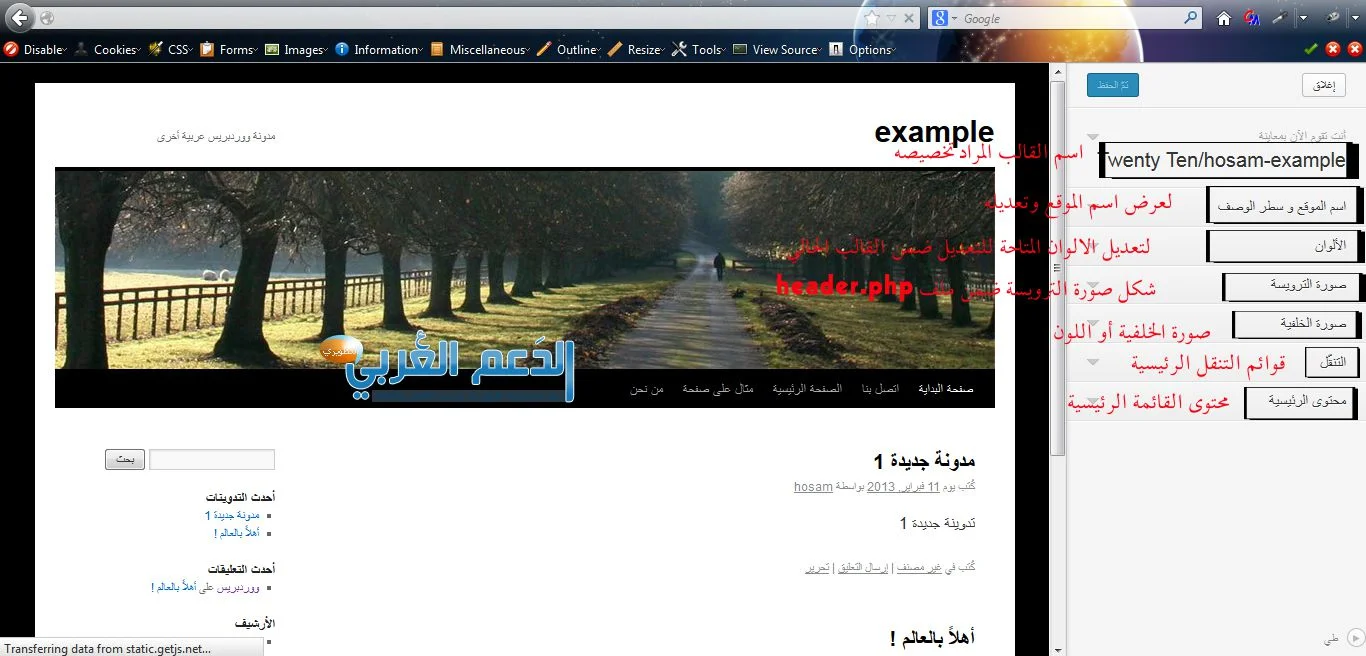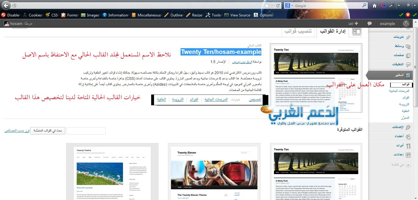 حول تركيب القالب ضمن الطرق السابقة لنعتمد طريقة رفع الملفات دون ضغط لكي نستطيع فيما بعد العمل على القالب لدينا وتعديله ضمن لوحة التحكم في المسار الذي قمنا باختياره حيث نسمي القالب كما نشاء وضمن الدرس سأعتمد الاسم الخاص Hosam-example حيث سيكون قالبنا الذي سنعدل عليه لاحقاً مع الملاحظة للأمور التالية: