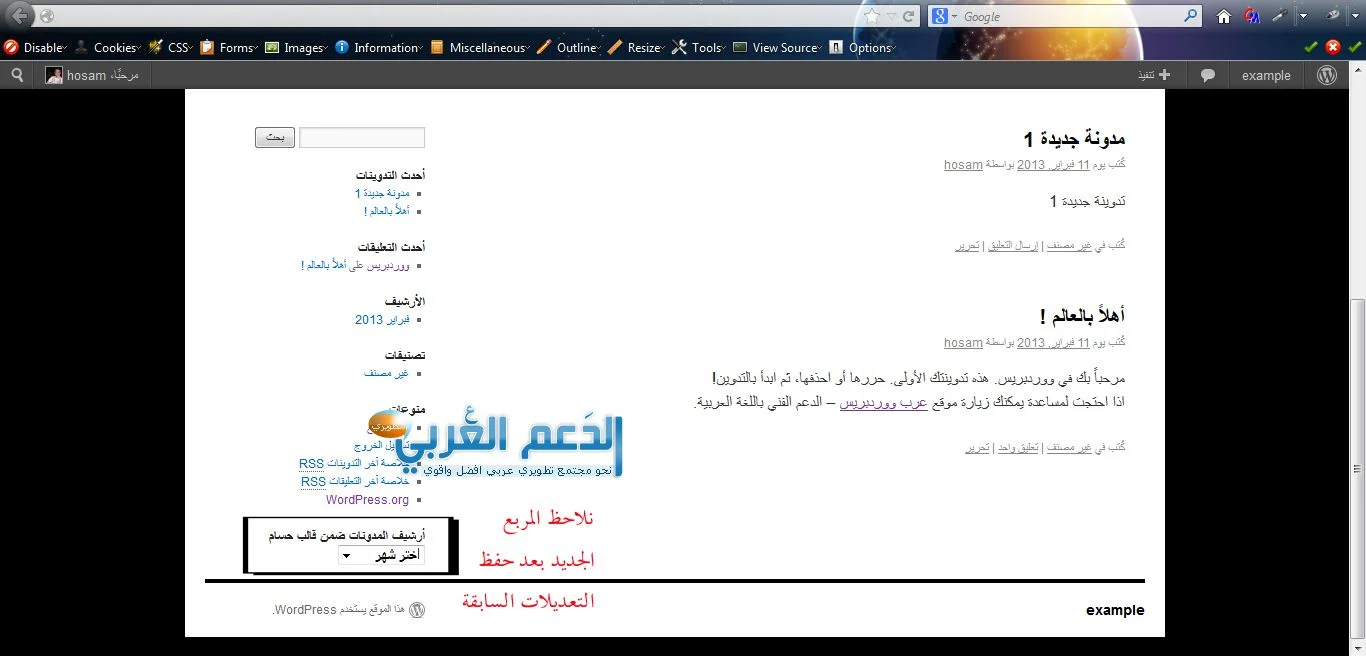 بعدها نلاحظ التعديلات ضمن المربع الجانبي قبل ضغط حفظ ثم بعد الضغط ستظهر اسم القائمة الجانبية (المربع الجانبي) جانب كلمة الأرشيف لنتأكد أن التعديلات تمت نذهب الآن لصفحة المدونة ونلاحظ التغييرات:
