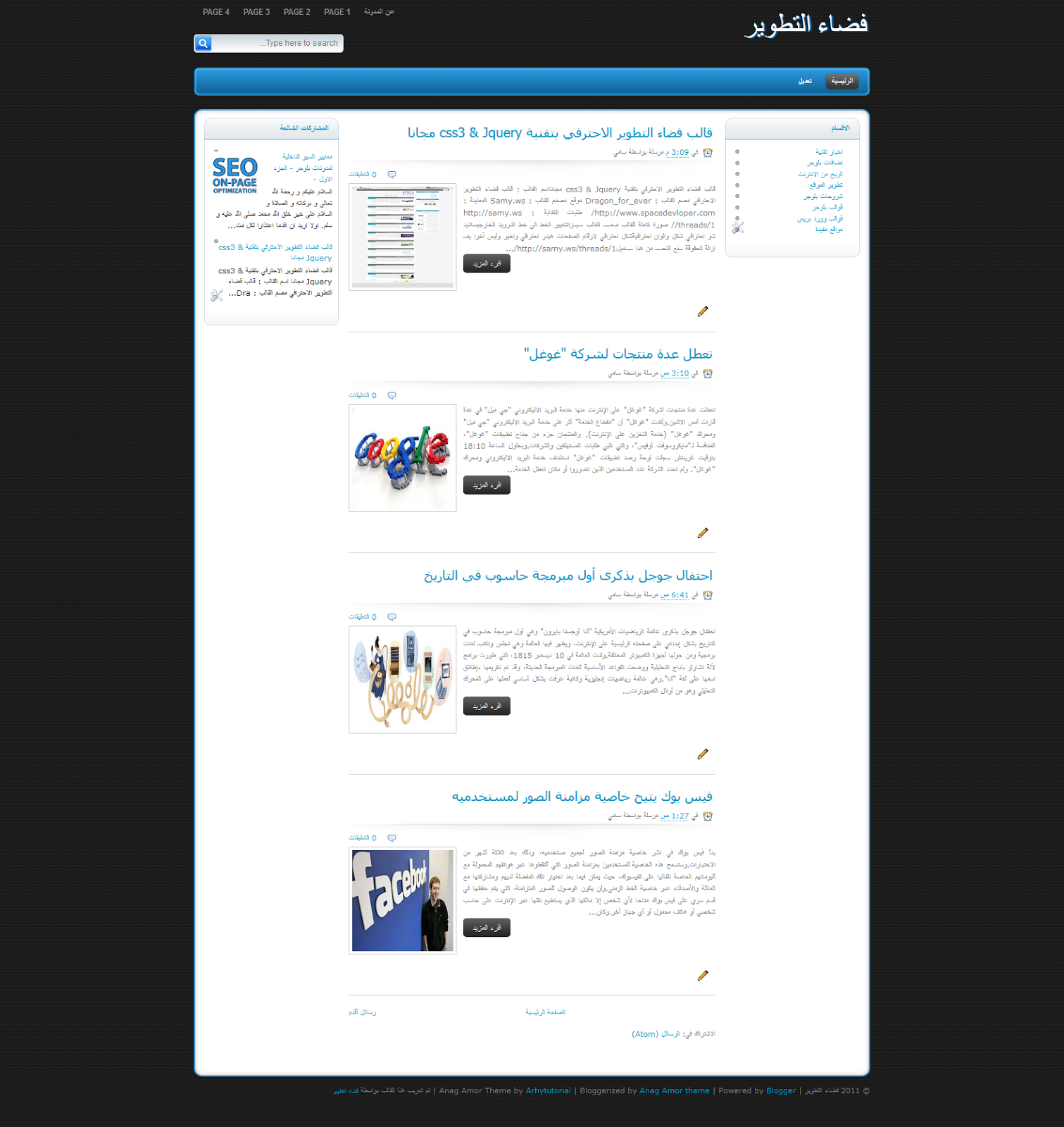 تعريب وتطوير قالب Anag Amor ازرق واسود تم تعريب قالب anag amor بواسطة مدونة فضاء التطوير وهو قالب احترافي بثلاثة اعمدة وشكل بسيط يصلح لجميع انواع المدونات صورة القالب https://www.box.com/s/dhy7i750nl7qlsawxsry المصدر : تعريب وتطوير قالب Anag Amor ازرق واسود