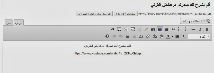 [FONT=Arial,Helvetica,sans-serif]لتفعيل اضافة الفيديو بالورد برس استخدم اضافة smart-youtube واضافة حرف v بجانب الرابط ليصبح هكذا httpv:// لاظهار فيديو داخل الموضوع كما بالصوره[/FONT]