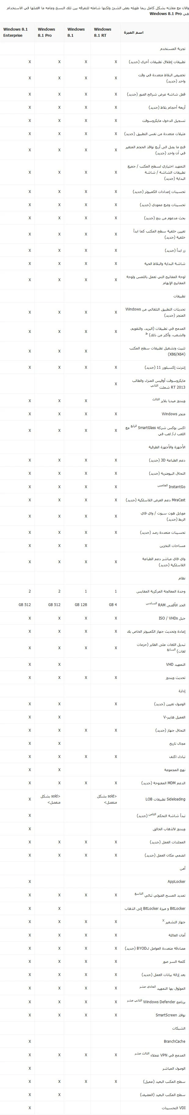 والان مع مقارنه بشكل كامل ربما طويله بعض الشئ ولكنها شامله للتفرقه بين تلك النسخ وعامه ما افضلها في الاستخدام هي Windows 8.1 Pro
