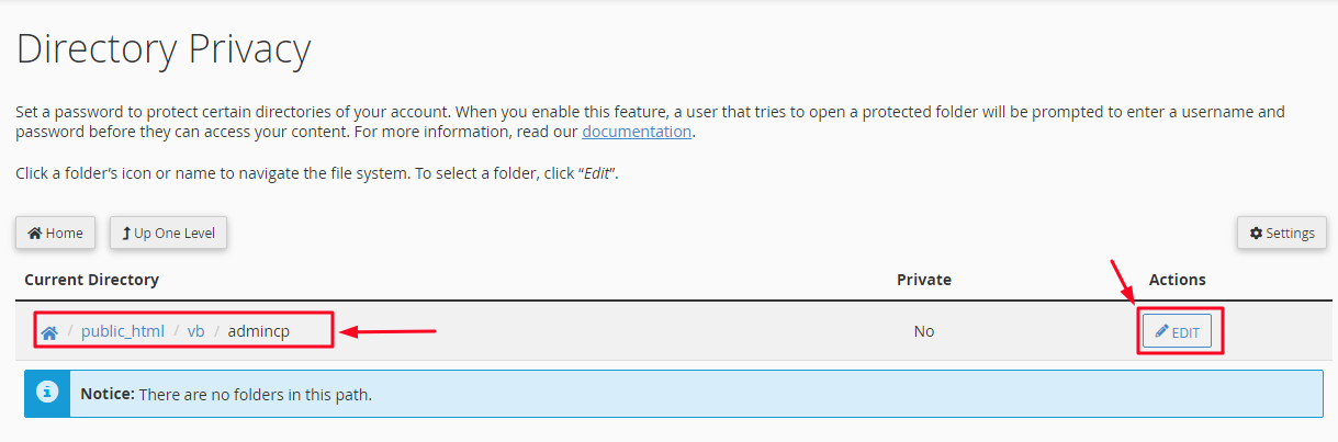هذا القسم من cPanel مخصص لحماية كلمة المرور. وبالتالي، فهي المحطة الأولى حول كيفية وضع قفل بكلمة مرور على مجلد.سترى الآن قائمة كاملة بجميع المجلدات الخاصة بموقعك. انقر على المجلدات للوصول إلى المجلد الفرعى المطلوب حمايته وليكن admincp، ثم اضغط على Edit كما في الصورة