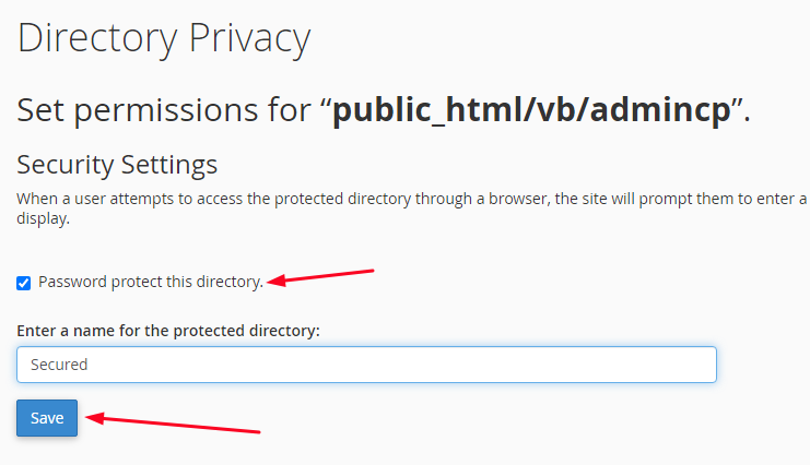 هناك خطوتان لحماية المجلد بكلمة مرور. الأول يتضمن اختيار اسم المجلد، والثاني هو إضافة اسم مستخدم و كلمة مرور إلى المجلد.قم بالتأشير على المربع بجوار "Password protect this directory" وسيفتح مربع النص الموجود أسفله. في مربع النص هذا، يجب عليك إدخال اسم للدليل. انقر على زر "حفظ" بعد الانتهاء.