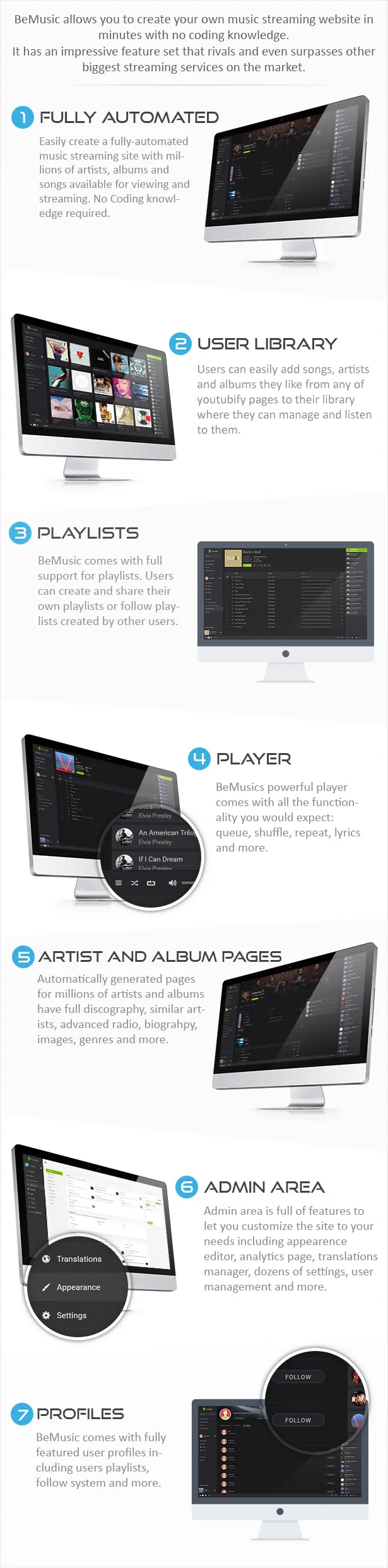 - Appearence Editor – Powerful appearance editor will allow you to easily change the look of BeMusic without any coding knowledge.