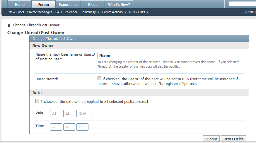 - Can change owner and date of selected posts and threads (including database attachments - it will not move file attachments)