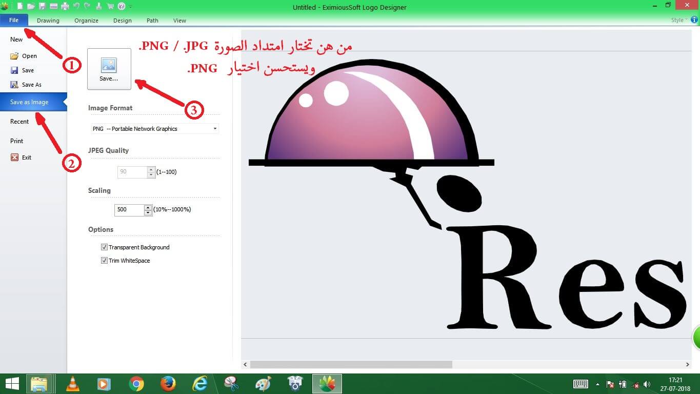 [FONT="]بعد التعديل على الشعار و الانتهاء منه اضغط على file ثم Save as image على أساس حفضه كصورة ومن Scaling يمكنك التحكم في دقة الصورة من 10 الى 1000 وأنصحك ب 500 فما فوق. كلما اخترت رقم اكبر كلما ازدادت دقة الصورة. بالتالي حجم الصورة ويمكن أن يصل حجم الصورة أحيانا إلي 80 Mb.[/FONT]