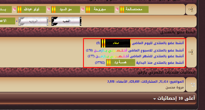 - تقوم البرمجية بإخفاء النتائج الصفرية تلقائياً، أى أنه فى حالة عدم وجود أى مشاركين بالمنتدى بالأمس فلن تظهر خانة أنشط الأعضاء بالأمس أصلاً.