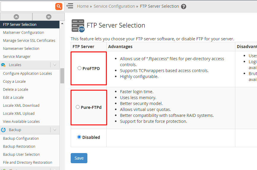 تأكد من أن خدمة FTP تعمل على السيرفر من الخيار التالي FTP Server Selection كما بالصورة، إذا كانت العلامة على Disabled اختر البرنامج المناسب ثم إضغط حفظ