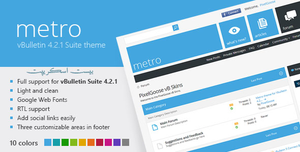 قمنا بوضع قالب مترو لمنتديات vBulletin 4.2، والذي أتمنى أن تستمتعدوا بهذا القالب الجميل للغاية.للاطلاع على مثال للقالب والتحميل بالمرفقات. القالب متوفر بـ 10 ألوان مبهجة وجميلة.