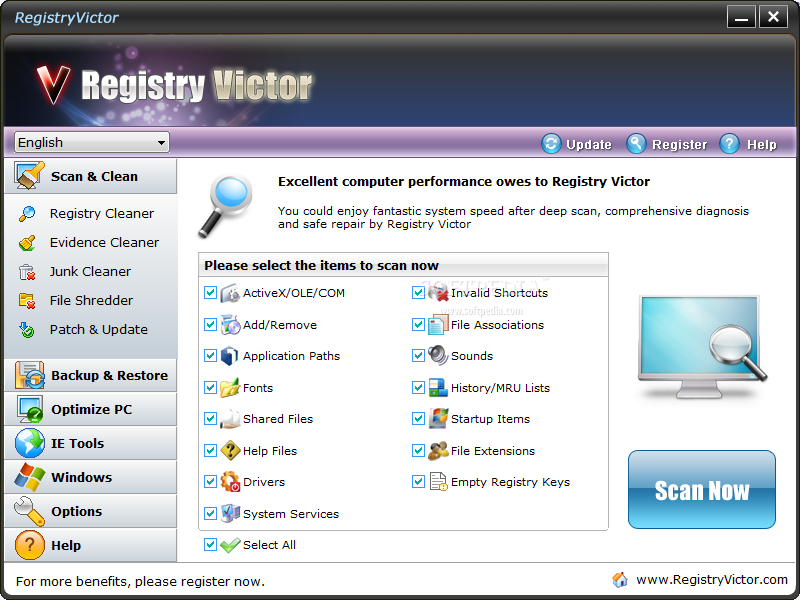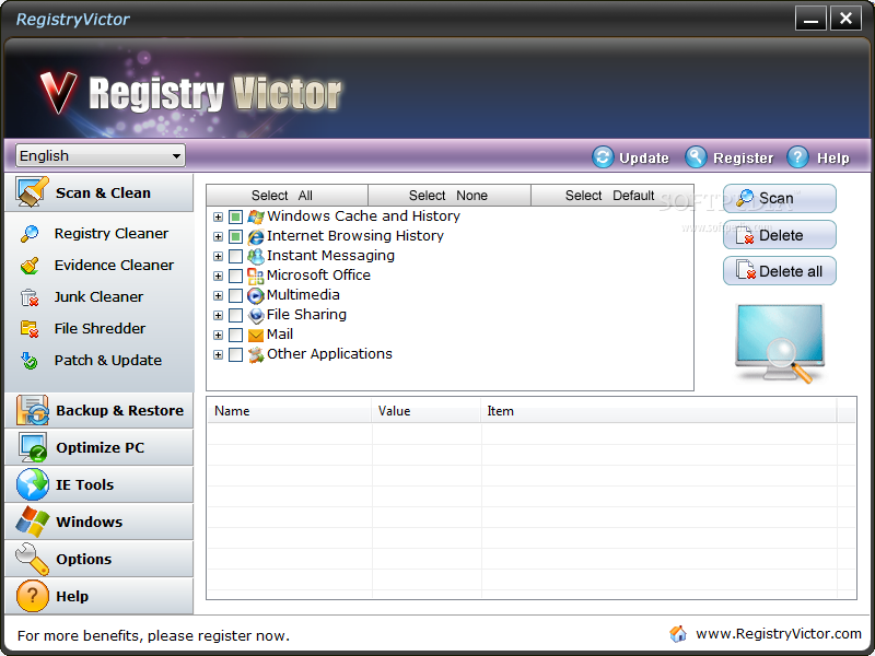 كما ان برنامج Registry Victor يحمي سريتك وخصوياتك بمسح اثارك من الكمبيوتر ومن الانترنت باسرع واسهل وافضل الطرق .. كما يقوم برنامج Registry Victor بعمليه مسح اي ملفات معطوبة او تالفه او زباله يتم حفظها في النظام ويترك لك في الهاردسك مساحه جيدة لحفظ ملفات هامة افضل من التالفة .. كما انك ومع برنامج Registry Victor تقدر تصلح مشاكل النظام ويصلح مشاكل الذاكرة ويراقب برنامج Registry Victor الملفات الداخلة لجهازك ويحسن اداء نظامك وبرامجك وملفاتك والكثير غير هذا