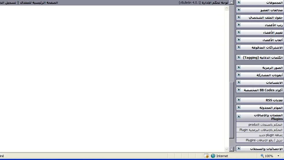 ارجو من المشرف حل المشكل: المشكل هو انه عندما اتوجه الى ادارة المنتدى وأريد اضافة هاك ما تطهر صورة بيضاء فقط ولا يظهر مكان اضافة الهاكات الصورة في المرفق توضح مع العلم ان مكان اضافة الهاكات كان شغال 100% بعد تركيب المنتدى