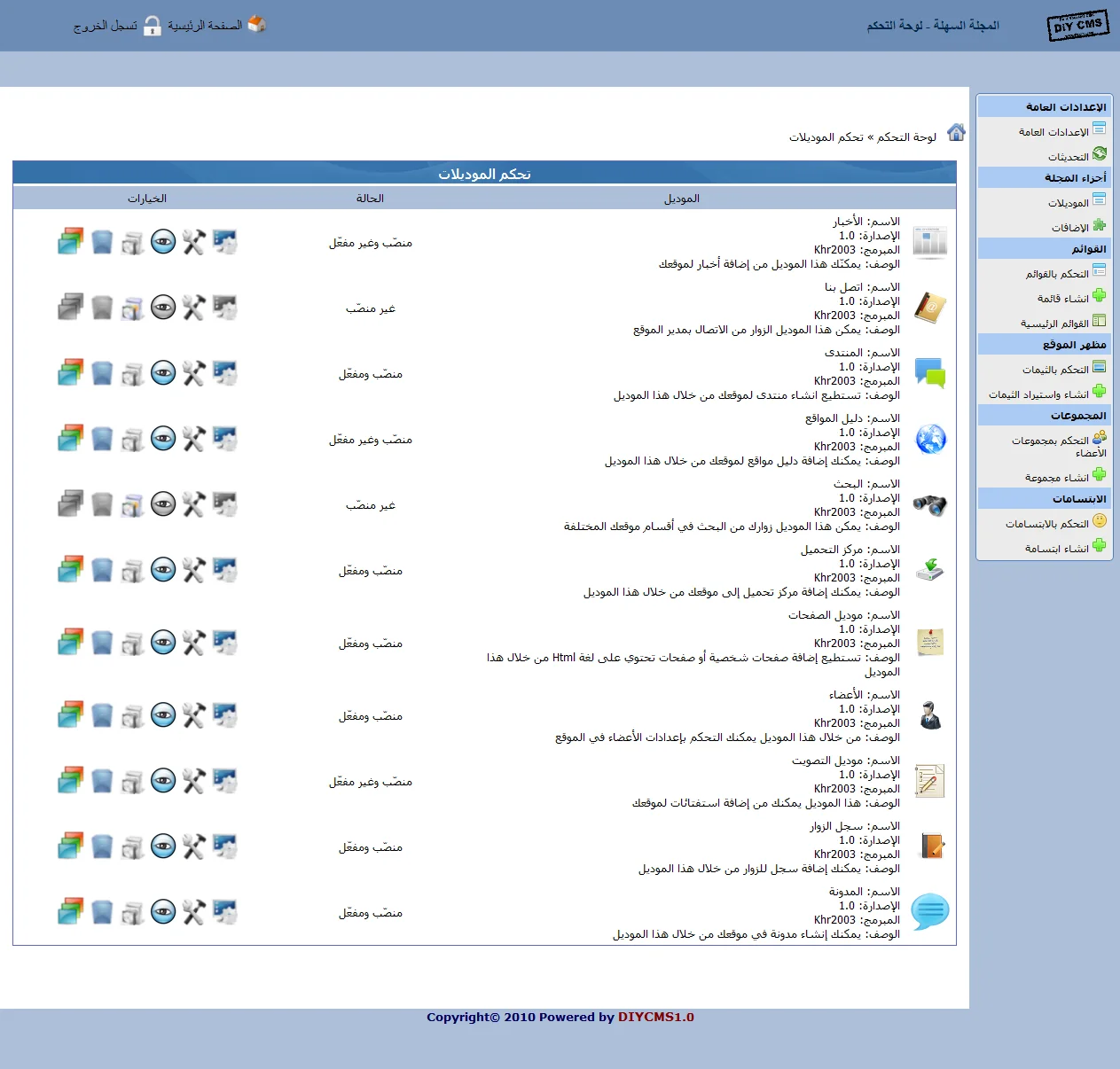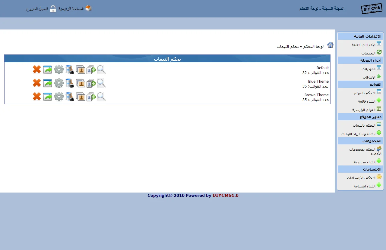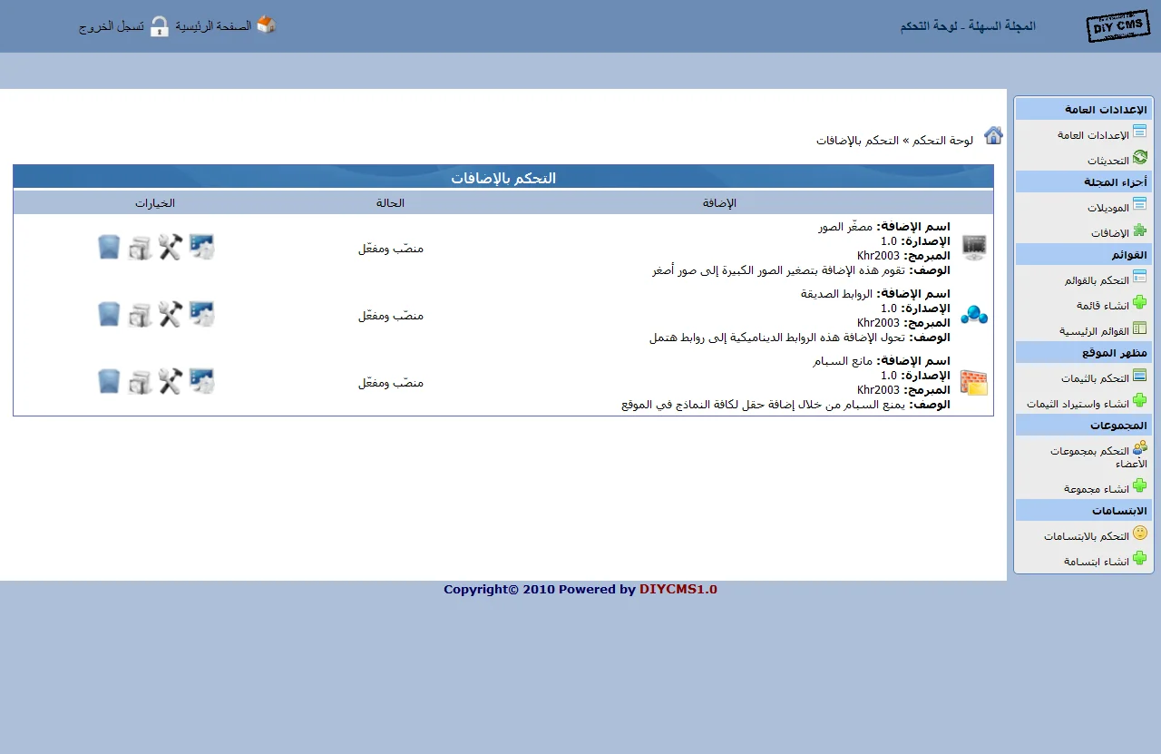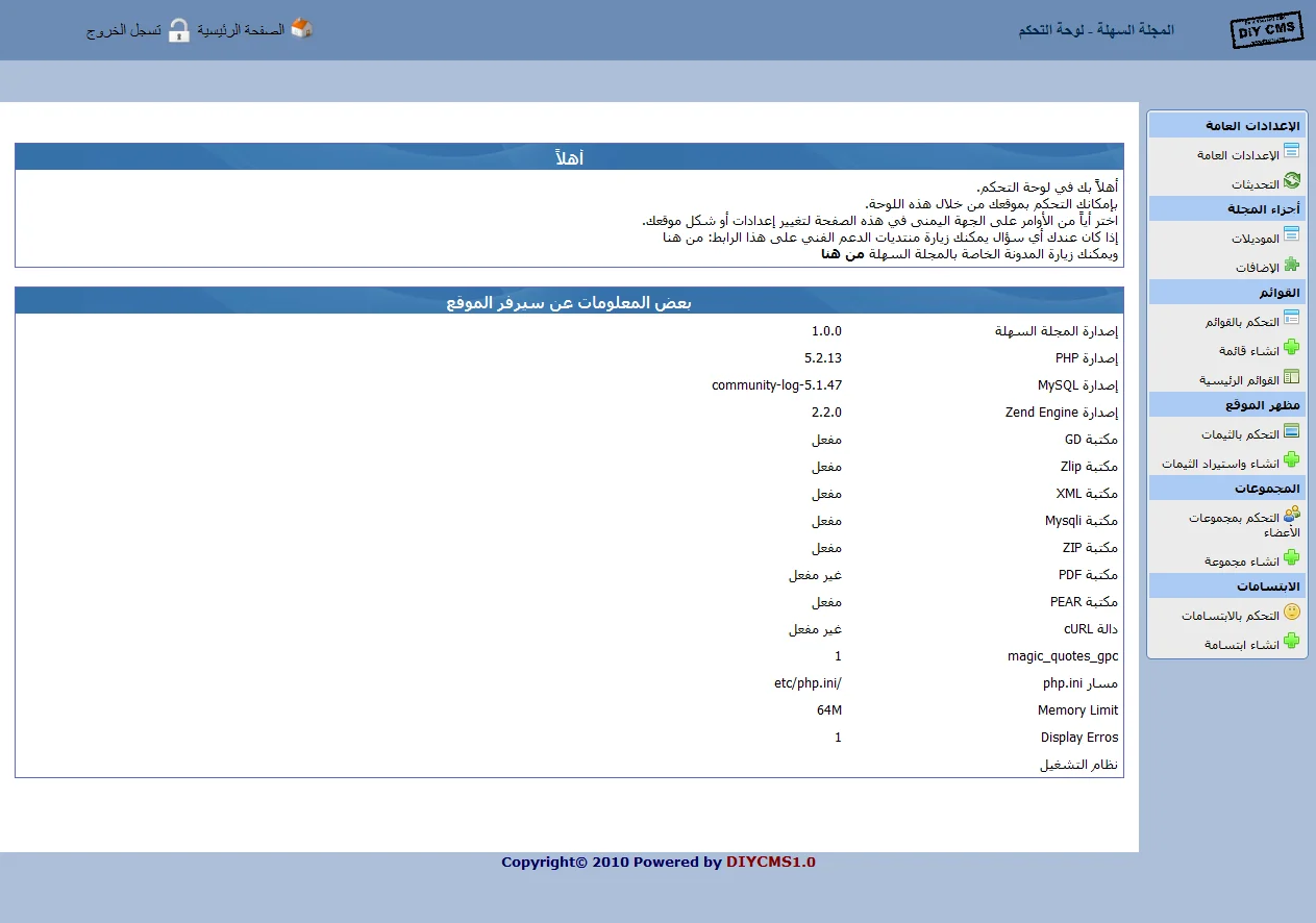 لرؤية مثال للوحة التحكم: http://www.diy-cms.com/demo_arabic/admin
