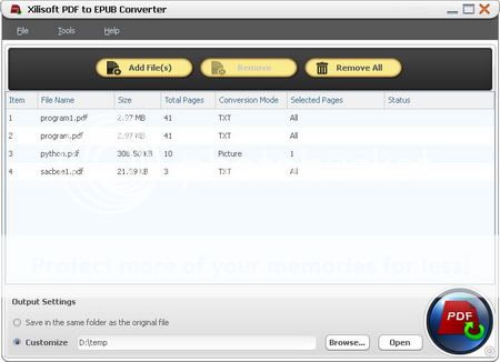 [COLOR=black][FONT=Arial]Xilisoft PDF to EPUB Converter - aimed at electronic book (eBook) users looking for a quick, easy, and efficient way to convert PDF files to EPUB format, Xilisoft PDF to EPUB Converter makes it possible to view PDF files on eBooks by converting them to EPUB format. With Xilisoft PDF to EPUB Converter, PDF to EPUB conversion can be accomplished in just 2 steps: Drag and drop files to application and Hit "Convert"!