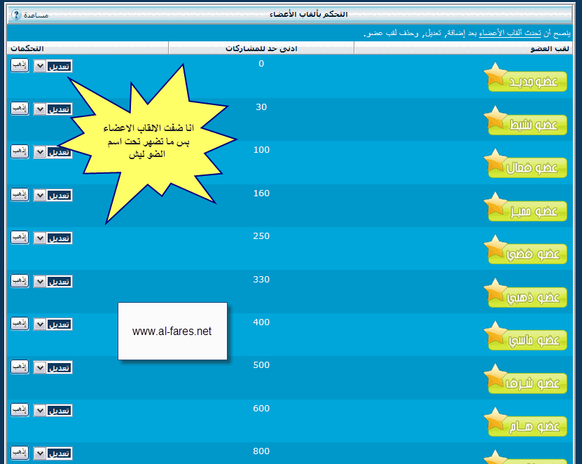 بسم الله الحمن الرحيم انا ركبت صور القاب الاعضاء اوك وضفتهم بس القاب ما تضهر تحت اسم العضو في الموضوع و الملف الشخصي ... شو تكون المشكلة شوفو الصور